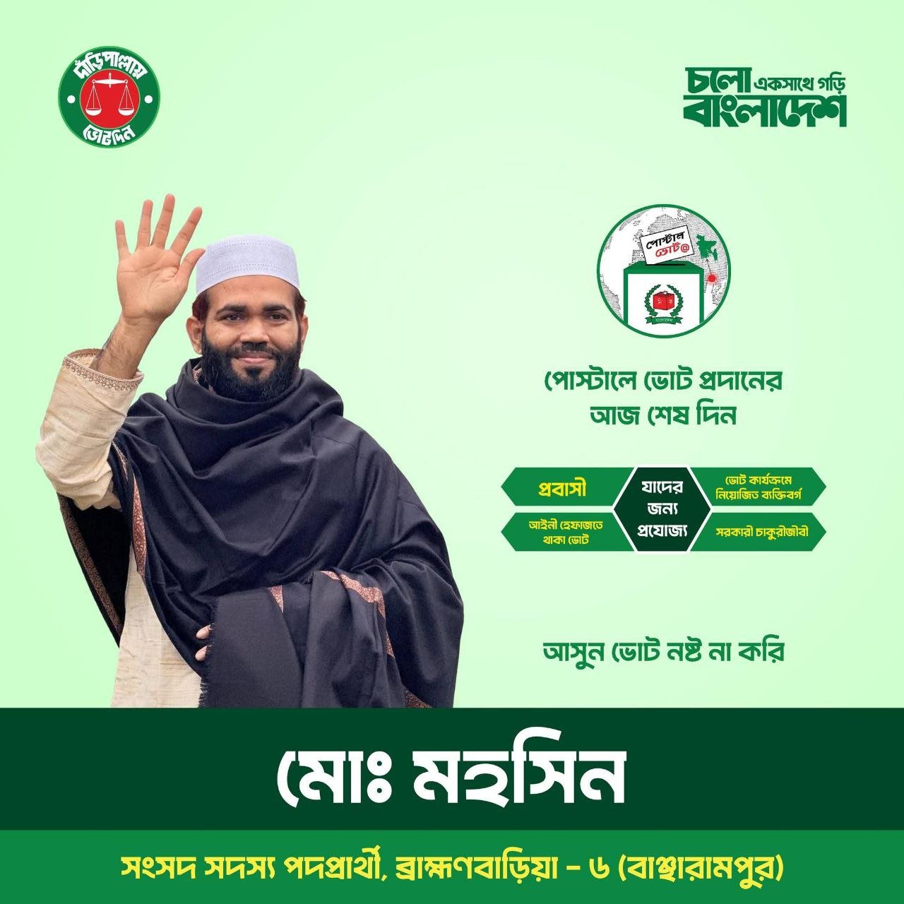 I am Md. Mahashin— the Jamaat-e-Islami nominated candidate for the Brahmanbaria–6 (Bancharampur) constituency. By the grace of Allah, I have been given the opportunity to serve my country, which I accept as a responsibility to build a just and people-centered society. মো. মহসিন একজন আপোষহীন মানুষ, যিনি রাজনীতিকে ক্ষমতার লড়াই নয়—বরং মানুষের খেদমত হিসেবে দেখেন। তাঁর বিশ্বাসের জায়গা একটাই—“আমরা শাসক নয়, খাদেম হবো।” পেশাজীবনে তিনি সফল উদ্যোক্তা হিসেবে বেশ খ্যাতি অর্জন করেছেন। তার হাতে গড়া কোম্পানি "Mygas" ঢাকা শহরে প্রায় ২৫০ এর অধিক প্রজেক্ট চালাচ্ছে। তিনি জগন্নাথ বিশ্ববিদ্যালয় থেকে ইংরেজি বিষয়ে অনার্স ও মাস্টার্স সম্পন্ন করেছেন। শিক্ষাজীবন থেকেই অন্যায় ও জুলুমের বিরুদ্ধে সক্রিয় ছিলেন। সত্য কথা বলার অপরাধে এবং ফ্যাসিবাদবিরোধী অবস্থানের কারণে তাঁকে ১৩ বার কারাবরণ করতে হয়েছে। জেল, মামলা কিংবা ভয়—কিছুই তাঁকে আদর্শের পথ থেকে সরাতে পারেনি। মহসিন ভাই জামায়াতে ইসলামীর মনোনীত সর্বকনিষ্ঠ প্রার্থী হিসেবে রাজনীতিতে এসেছেন নতুন চিন্তা, নতুন সাহস এবং নতুন প্রত্যাশা নিয়ে। তারুণ্যের জোয়ার জুলাই আন্দোলনে তিনি সক্রিয় ভাবে অংশগ্রহণ করেন এবং দায়িত্ব পালন করেন রামপুরা - বনশ্রী এলাকায়। বাঞ্ছারামপুরের মানুষ, তাদের কষ্ট, তাদের স্বপ্ন—সবকিছুই তাঁর রাজনীতির কেন্দ্রবিন্দু। স্বচ্ছতা ও জবাবদিহিতামুলক কার্যক্রম পরিচালনা করতে তার অনন্য পরিকল্পনা "এমপি সাহেব জবাব চাই"। মানুষের দোয়া ও ভালোবাসা নিয়েই তিনি সামনে এগোতে চান—একটি ন্যায়ভিত্তিক, মর্যাদাপূর্ণ বাংলাদেশ গড়ার অঙ্গীকারে।করেছি।